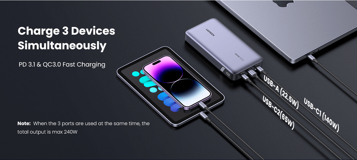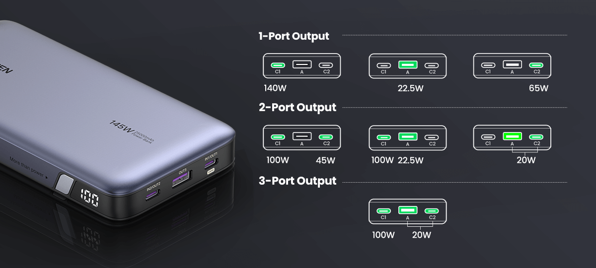 Ugreen 145W | بنك الطاقة 25000mAh لأجهزة الكمبيوتر المحمول-3 منافذ الطاقةBank