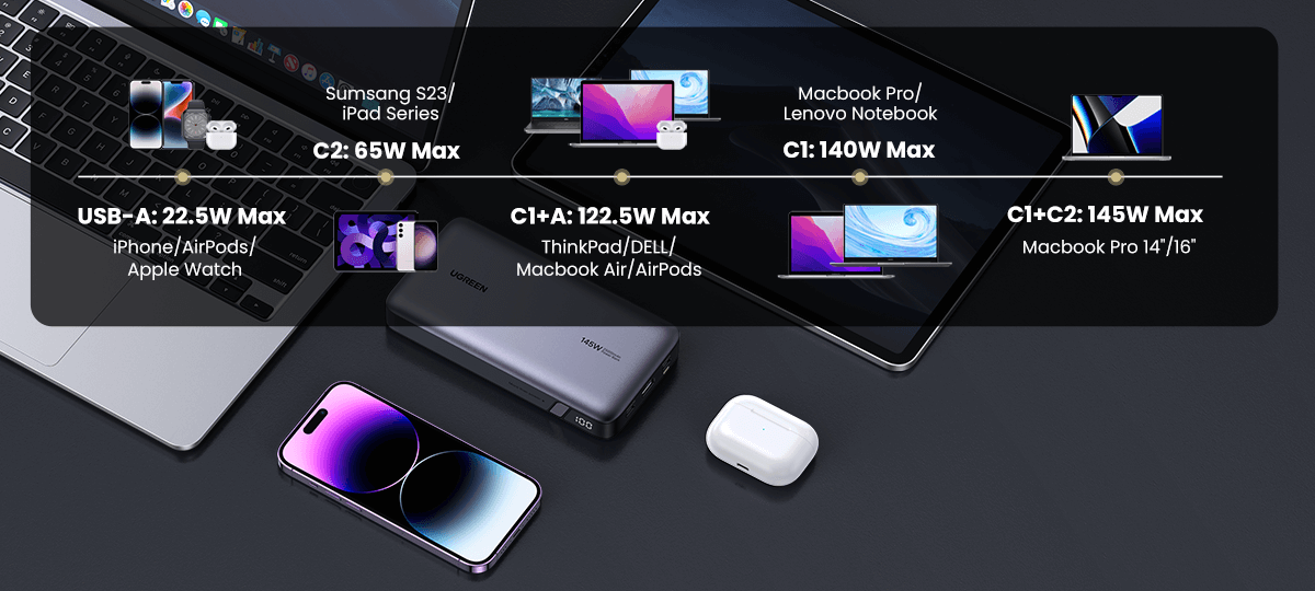 - باور بانك للابتوب: شاحن محمول يوجرين مزود بتقنية PD3.0، QC3.0، وقادر على شحن سريع 145 واط لجهاز اللاب توب الخاص بك! اشحن جهاز ماك بوك اير 2022 مقاس 13 انش بالكامل في 90 دقيقة.