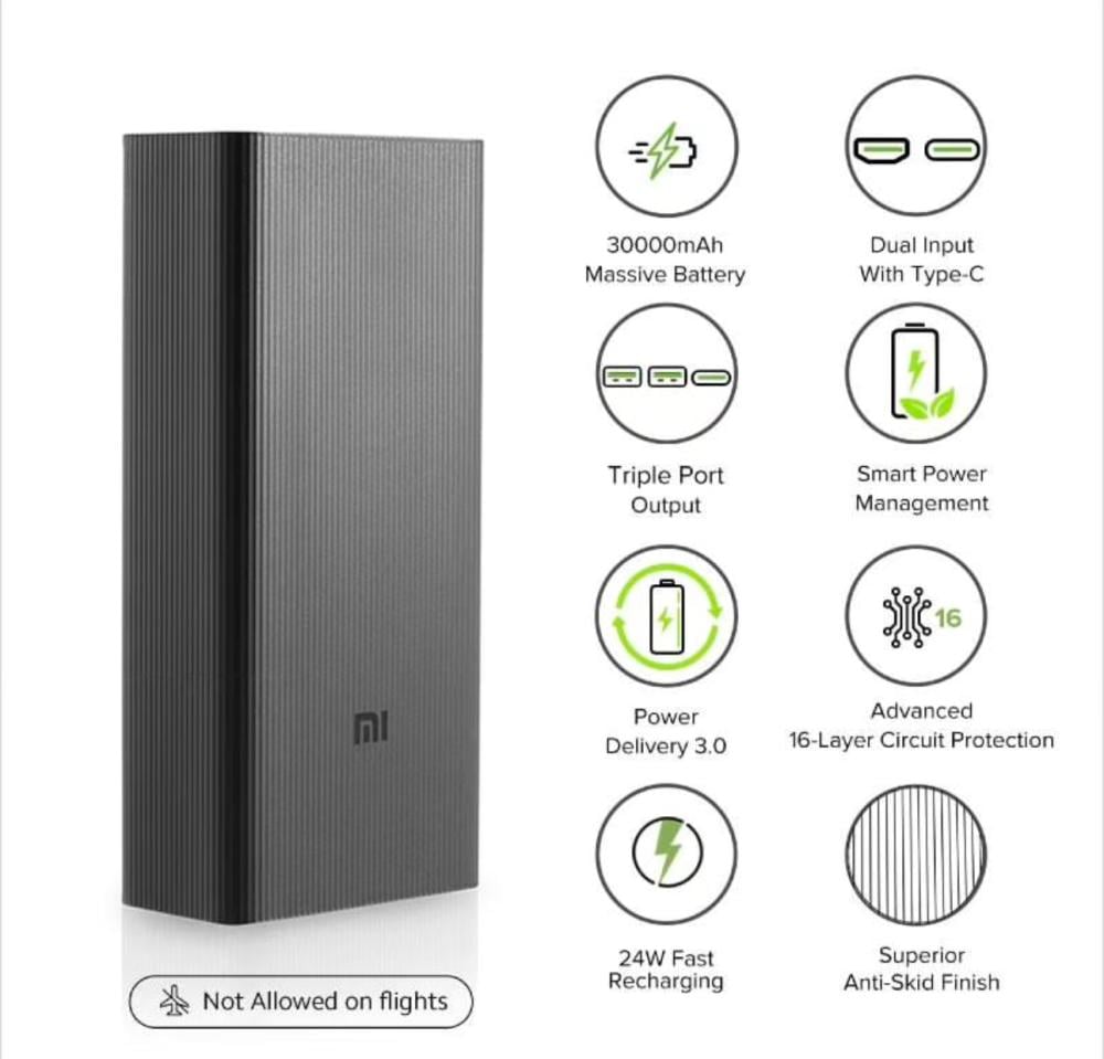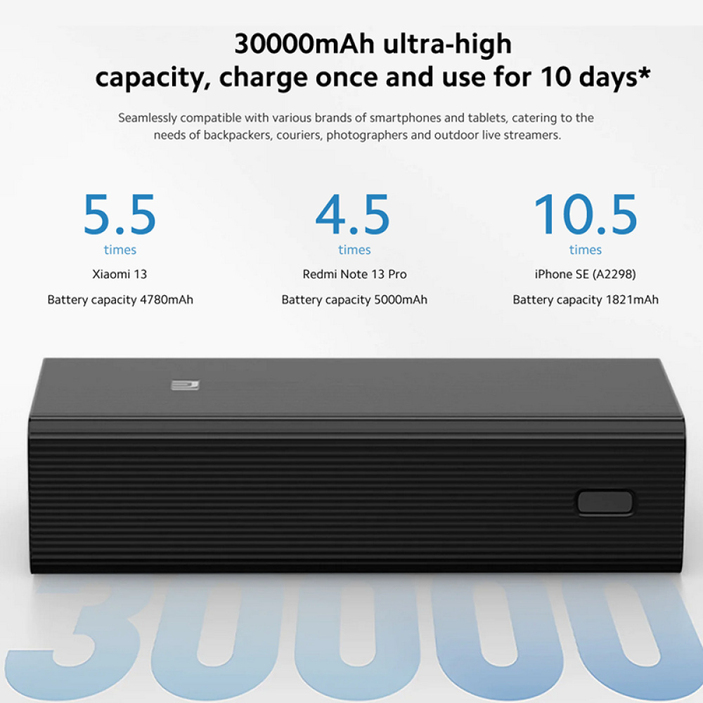 - سعة هائلة تبلغ 30,000 مللي أمبير، تتيح لك شحن الأجهزة المحمولة عدة مرات دون الحاجة لإعادة شحن الشاحن نفسه.