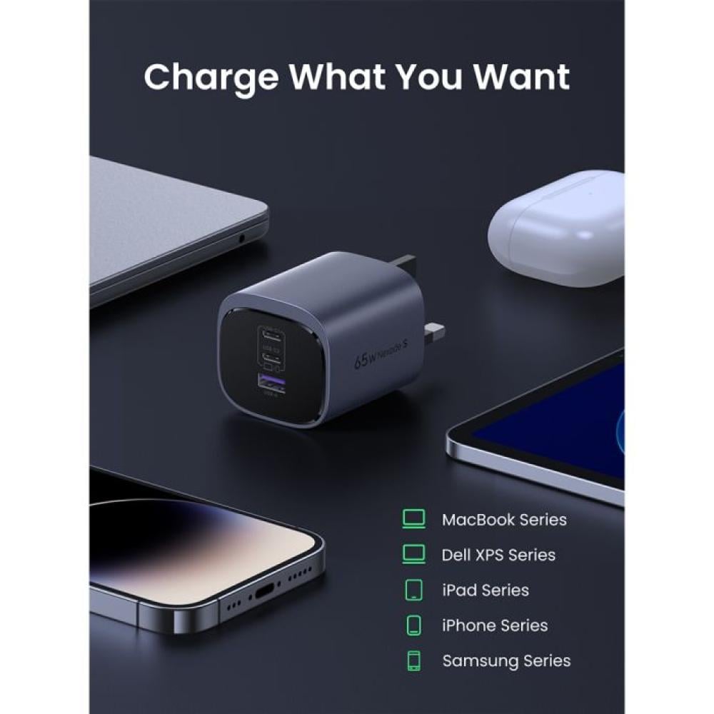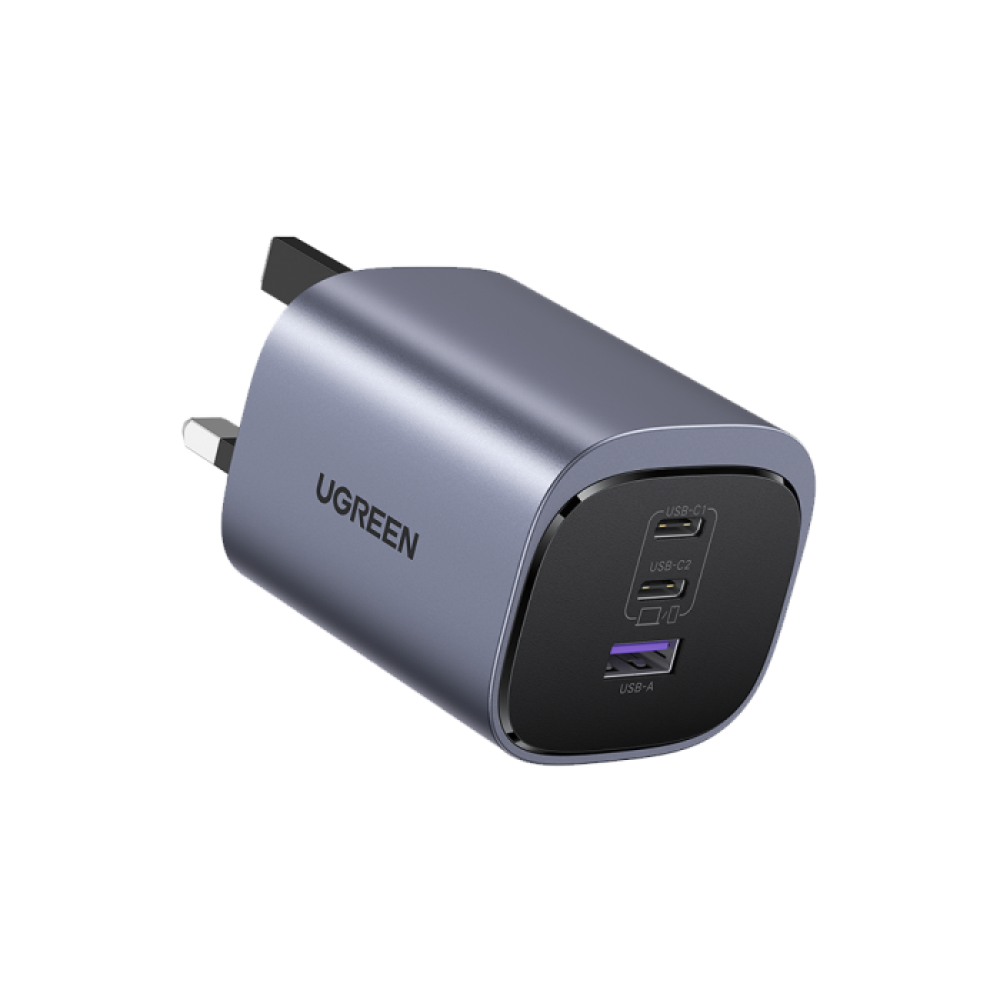 شاحن جداري يوجرين نيكسود S بتقنية GaN بمنفذين USB-C ومنفذ USB وبقوة 65 واط - رمادي