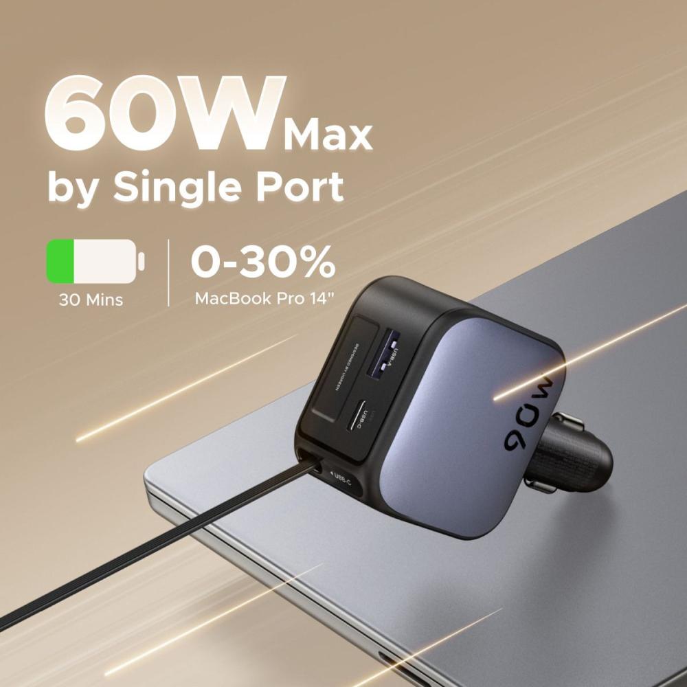 بالإضافة إلى التنظيم، يوفر الشاحن قوة فائقة 60 واط لينهي مشكلة الشحن البطيء. فهو يضمن شحن أجهزتك الحديثة (الهواتف، الأجهزة اللوحية) بأقصى سرعة ممكنة أثناء القيادة، لتصل إلى وجهتك ببطارية ممتلئة دائمًا. ولأنه يضم منفذين (USB-C المدمج و USB-A إضافي)، فهو يحل مشكلة الحاجة لشحن جهازين معاً بكفاءة عالية وبدون تنازل عن السرعة.